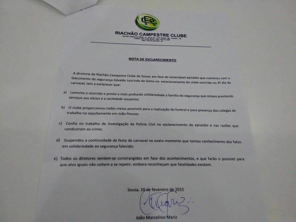 A diretoria do Riachão Campestre Clube de Sousa, em face do lamentável episódio que culminou com o falecimento do segurança Edvaldo Laurindo da Gama no estacionamento do clube ocorrido no 3º dia de carnaval, tem a esclarecer que:
