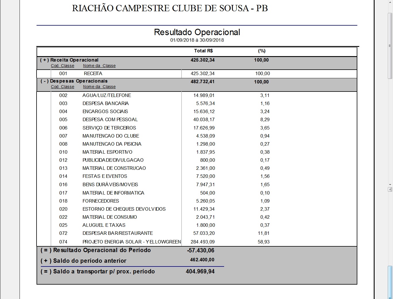 RESULTADO OPERACIONAL SETEMBRO 2018