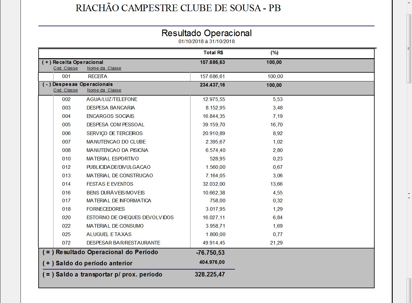 RESULTADO OPERACIONAL OUTUBRO 2018